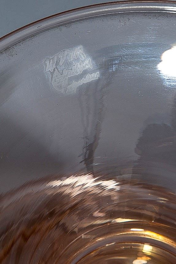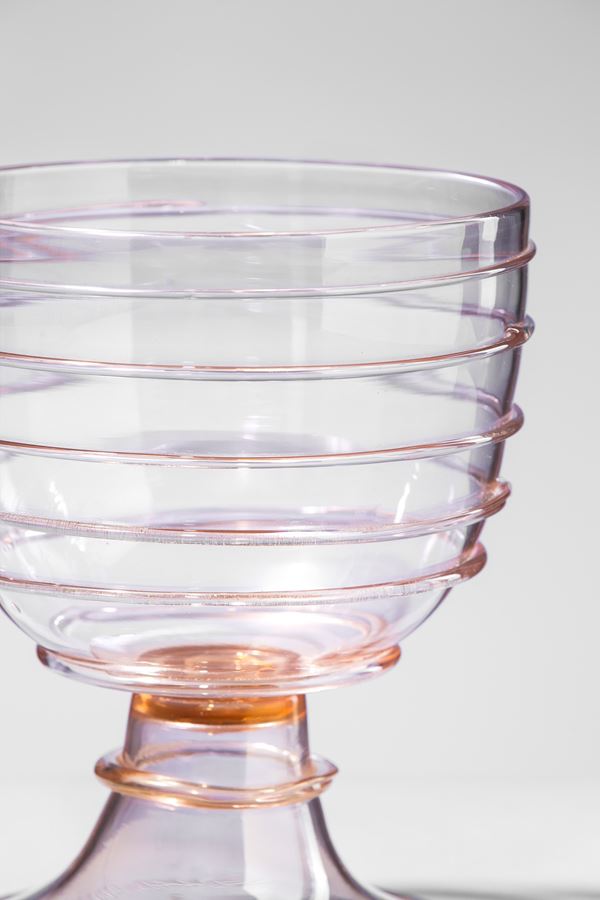 Vetro soffiato trasparente rosato con piede a campana decorato da fili vitrei applicati.