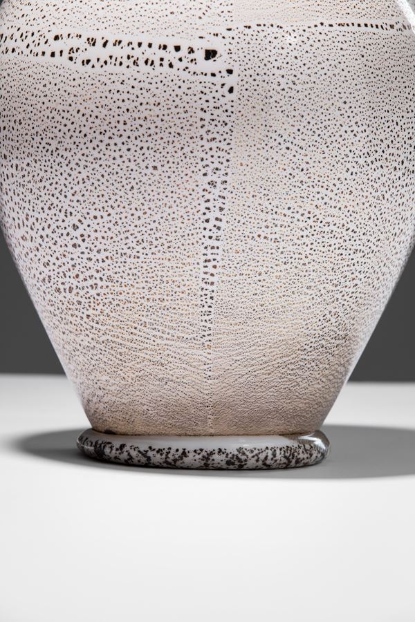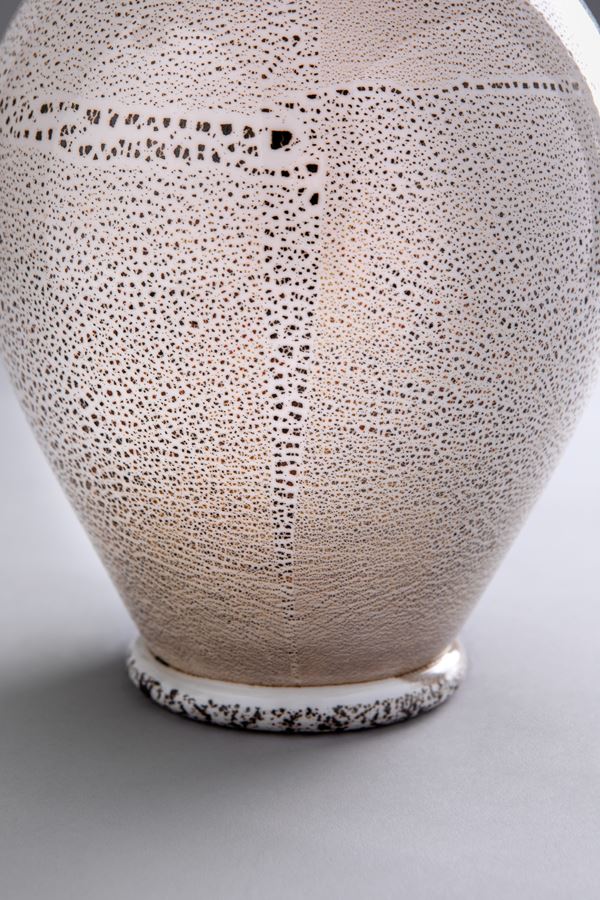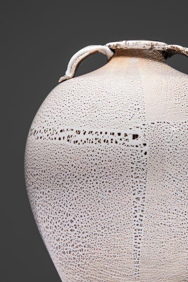 Vetro soffiato opaco bianco impreziosito da applicazioni di foglia d’oro ossidata su tutta la superficie.
