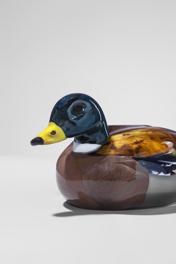 Anatra in vetro policromo con testa in vetro verde e becco in vetro giallo.