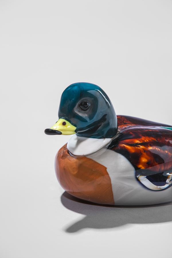 Anatra in vetro policromo con testa in vetro verde e becco in vetro giallo.