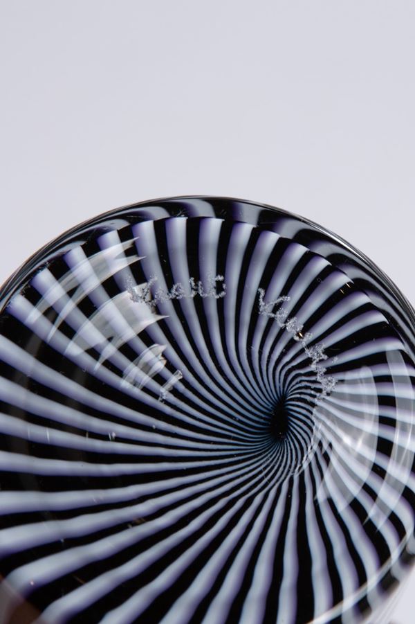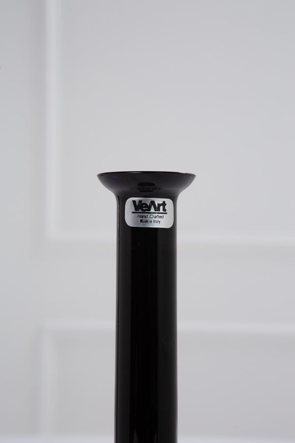 Vetro soffiato nero con inclusione di canne verticali bianco lattimo.