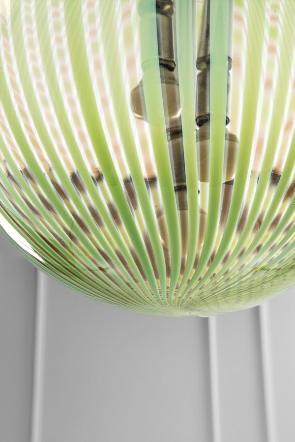 Metallo cromato, vetro trasparente con canne verdi e ambra.
