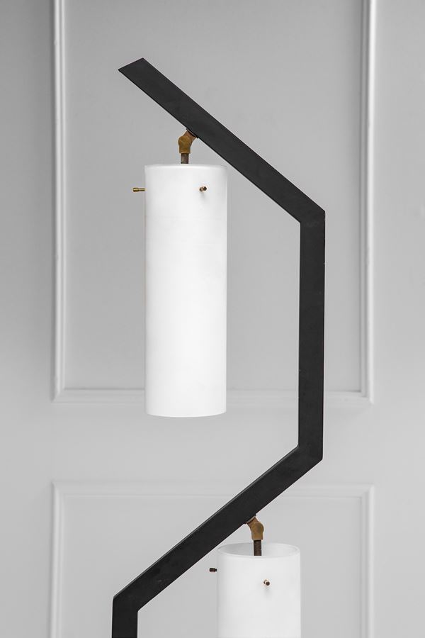 Metallo verniciato, ottone, vetro opalino satinato.