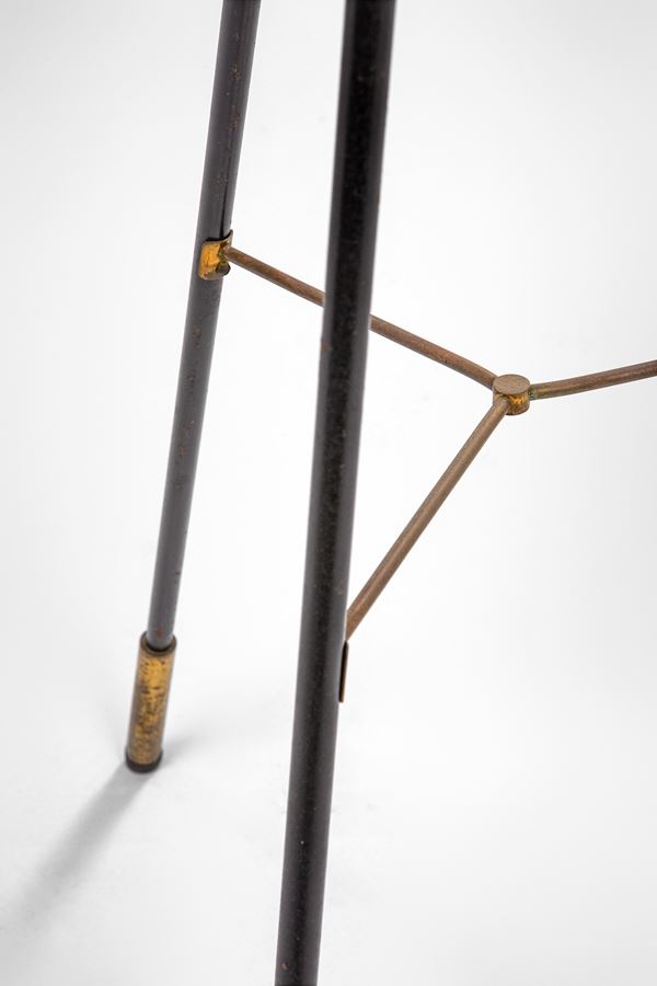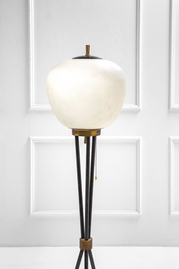 Metallo verniciato, ottone, vetro opalino satinato.