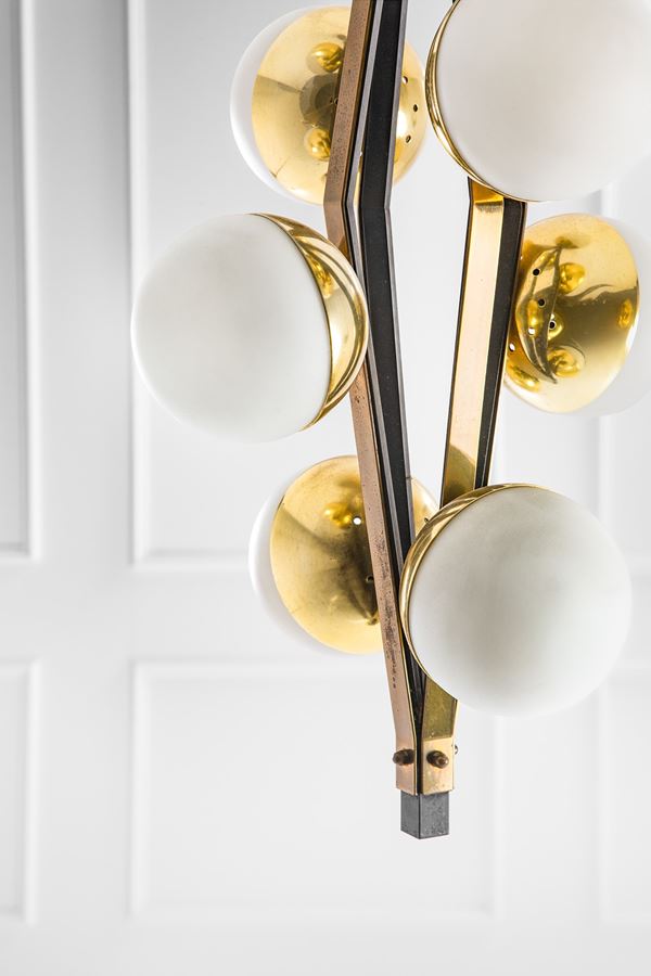 Metallo verniciato, ottone lucido, vetro opalino satinato.