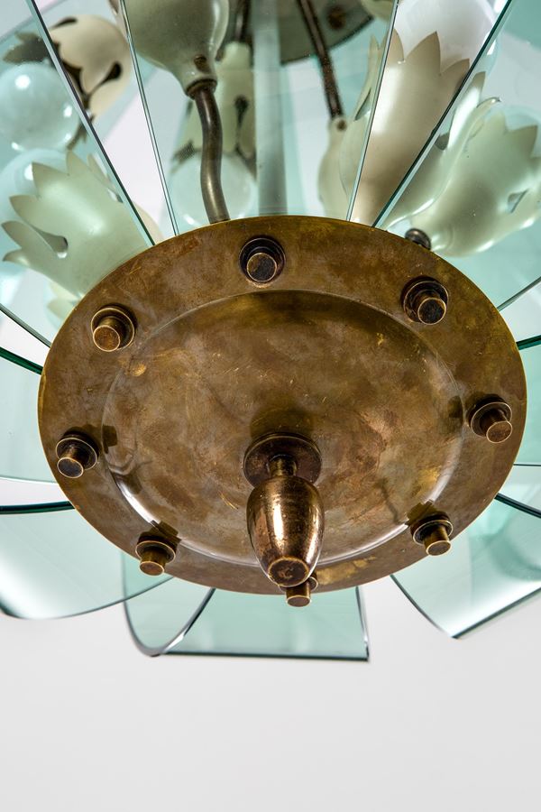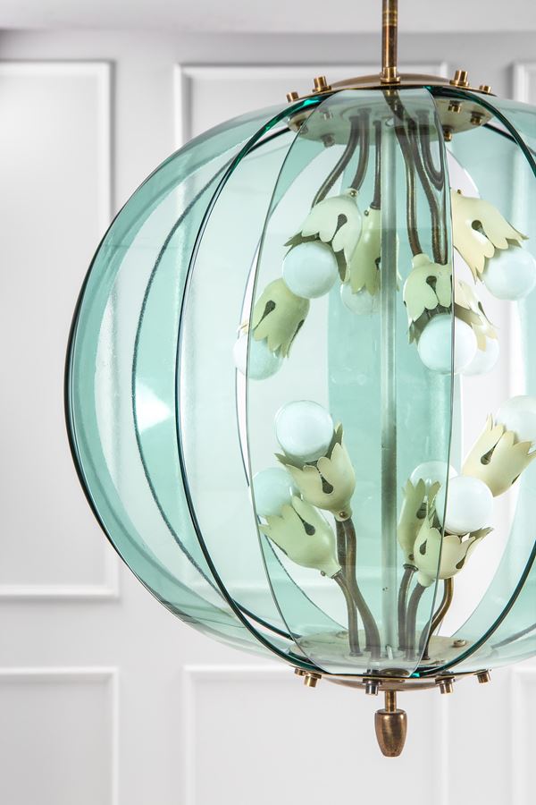 Cristallo trasparente curvato e molato, ottone, metallo verniciato.