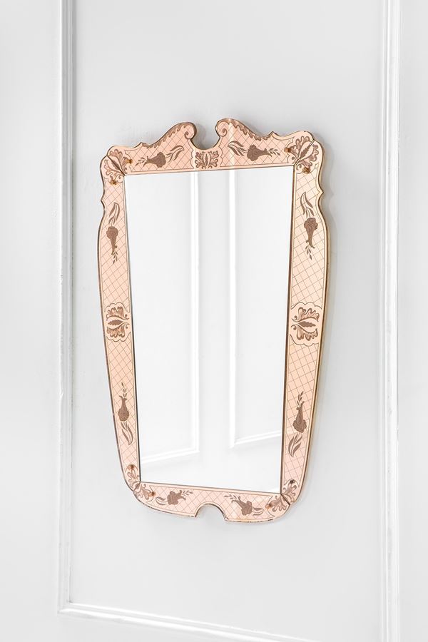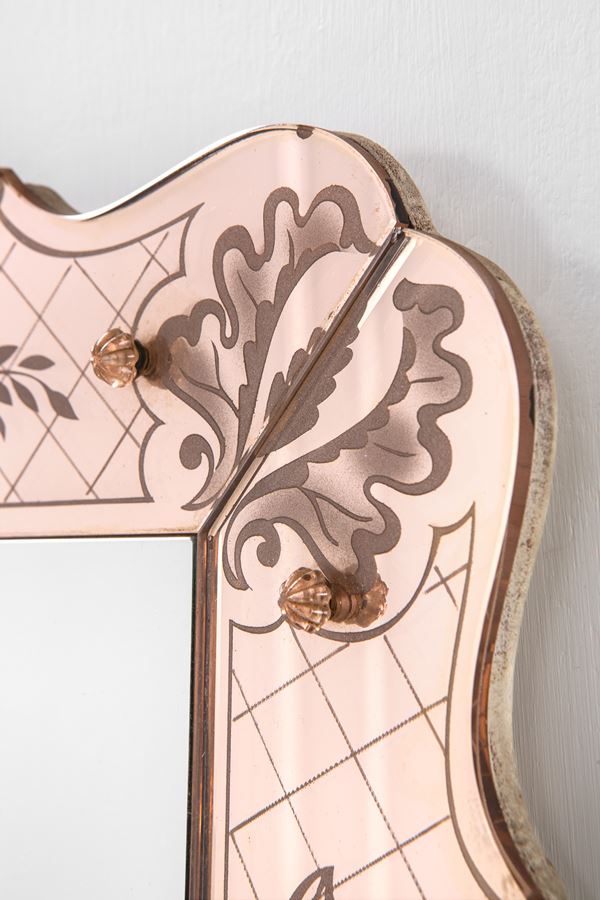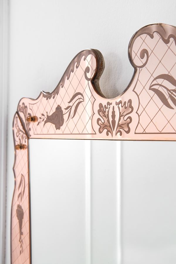 Cristallo colorato molato e specchiato a decori incisi e sabbiati, vetro specchiato.