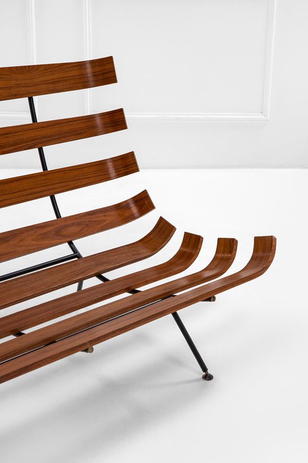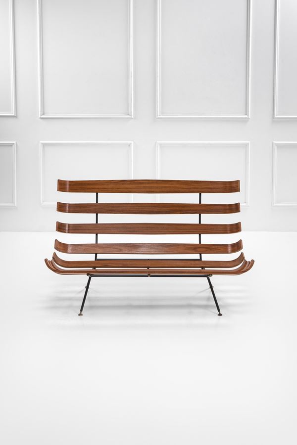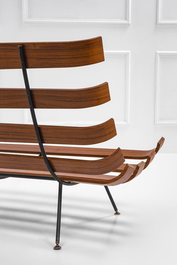 Compensato curvato laccato, tondino di ferro verniciato.