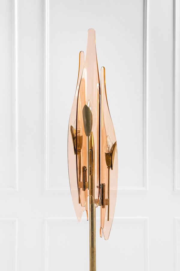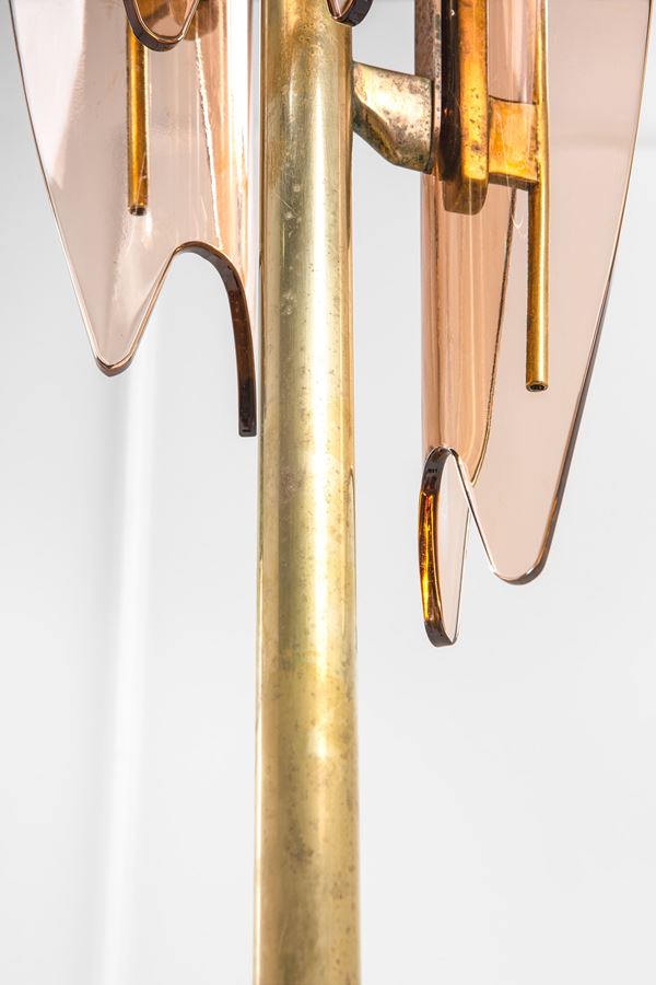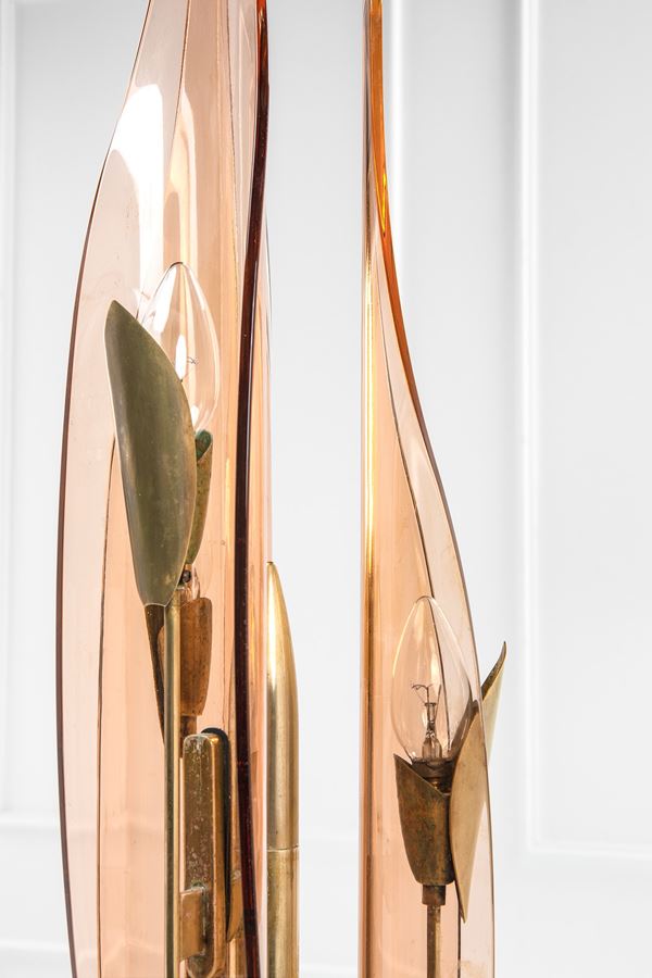Cristallo colorato curvato e molato, ottone, metallo verniciato.