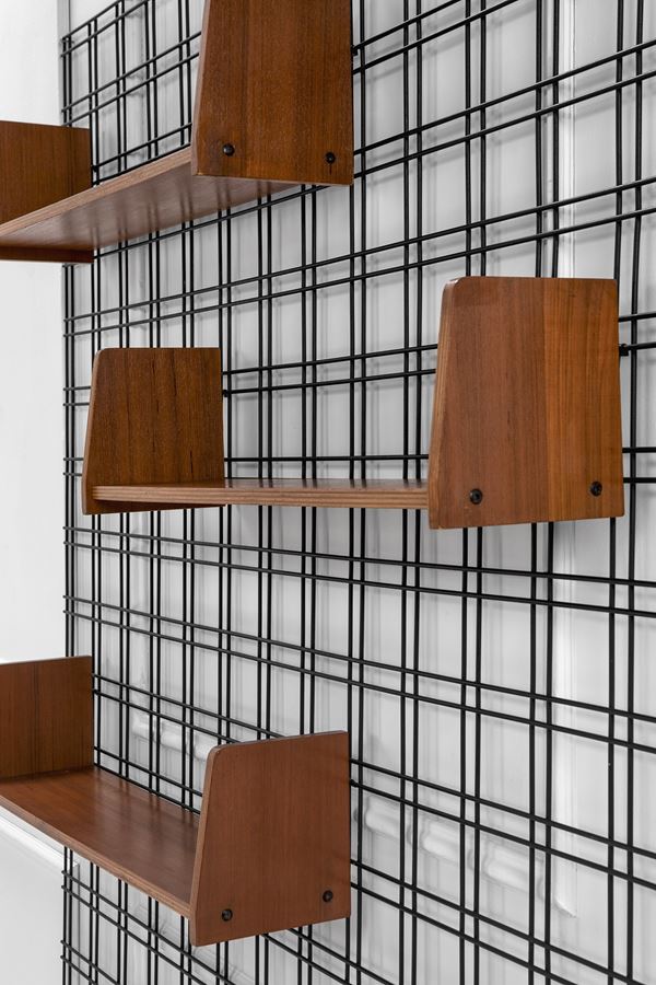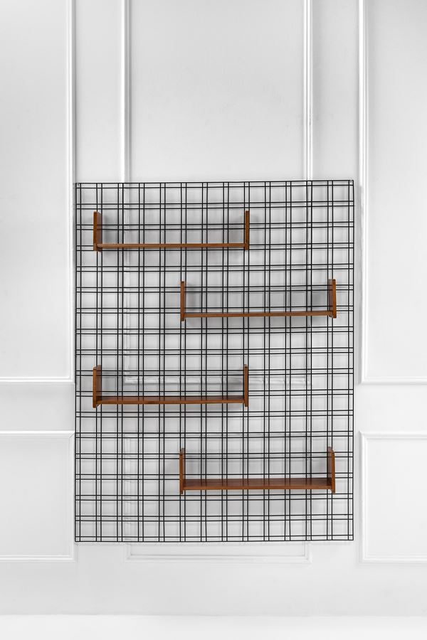 Griglia in metallo laccato, ripiani in legno multistrato curvato.
