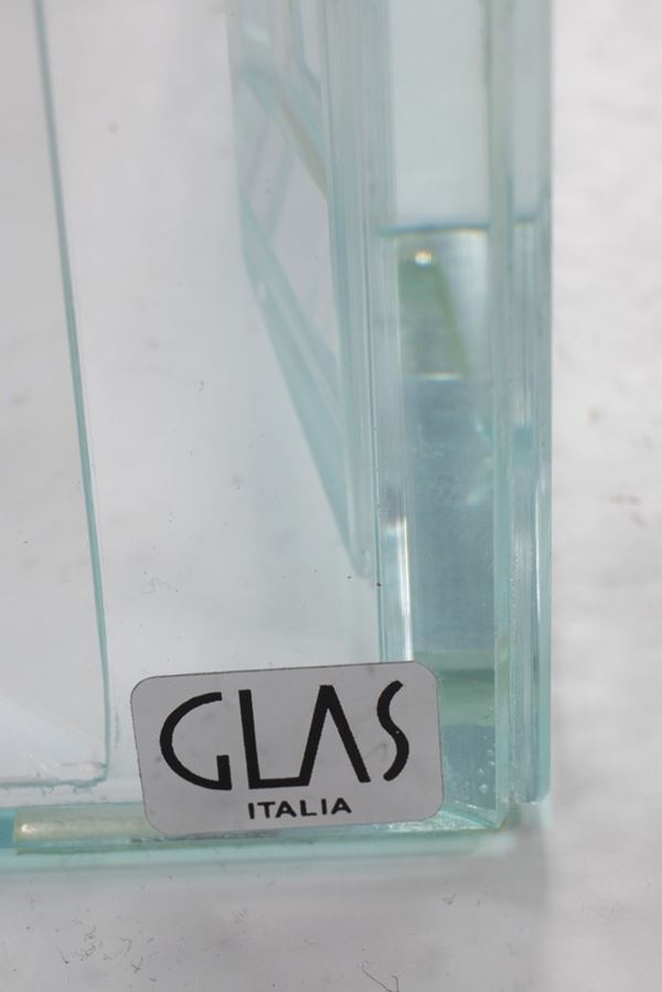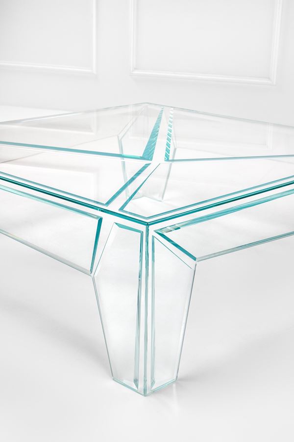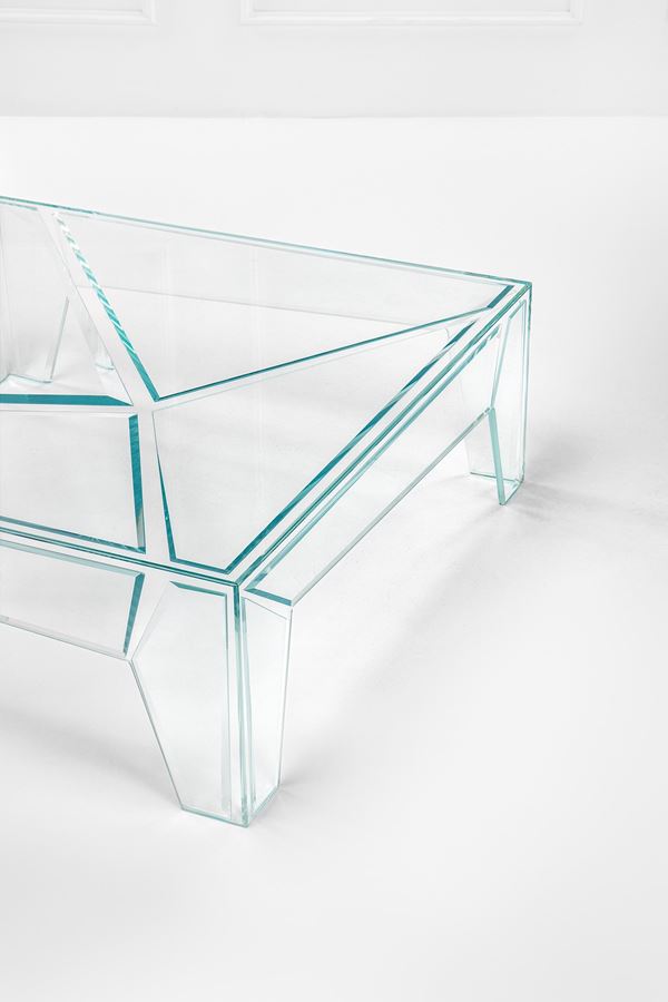 Cristallo trasparente extralight sulla cui superficie interna sono applicate lastre di cristallo extralight con forme irregolari e sfaccettate.