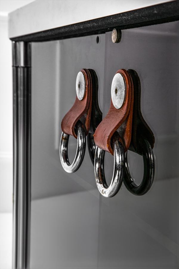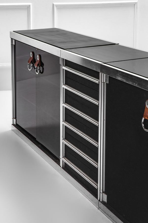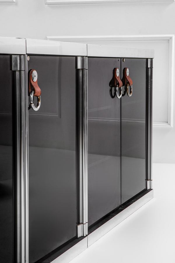 Legno laccato, metallo cromato, cuoio, tessuto, marmo, vetro.