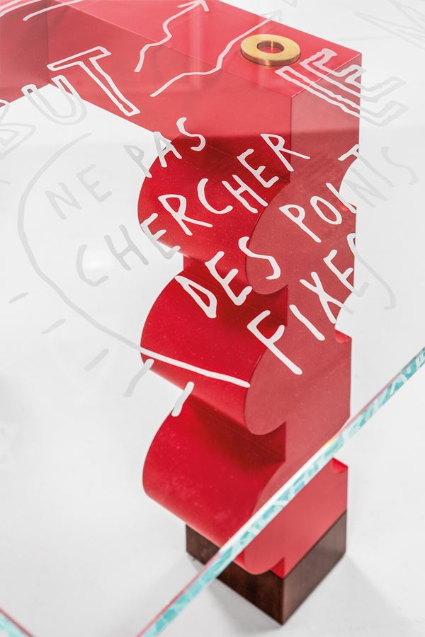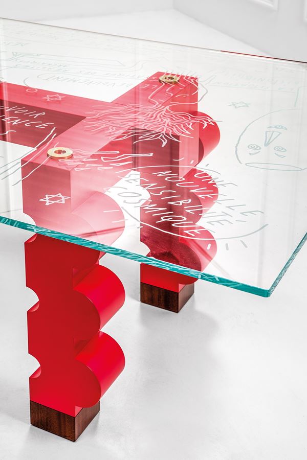Cristallo temperato inciso con una mappa concettuale di Alessandro Mendini, legno laccato opaco, legno naturale, supporti per il cristallo in ottone.
