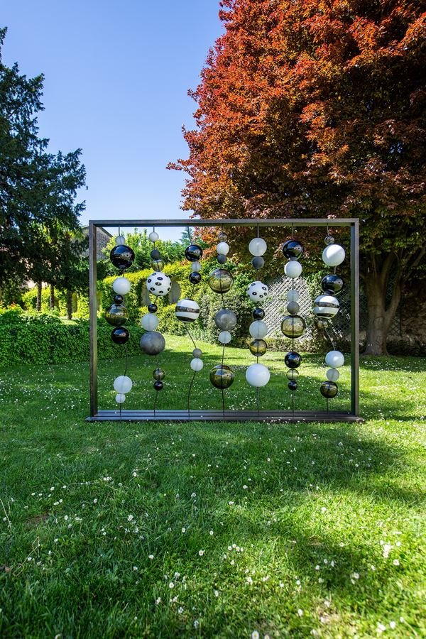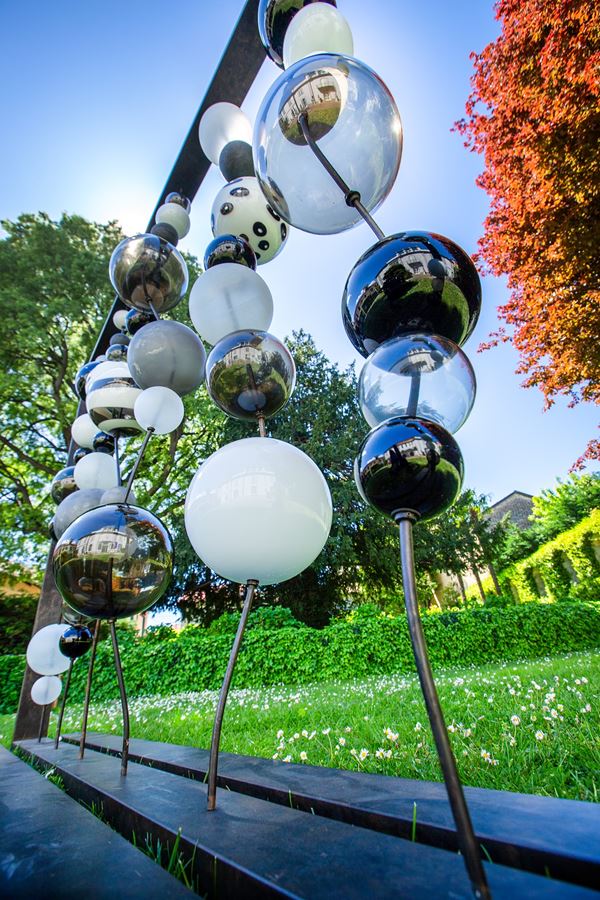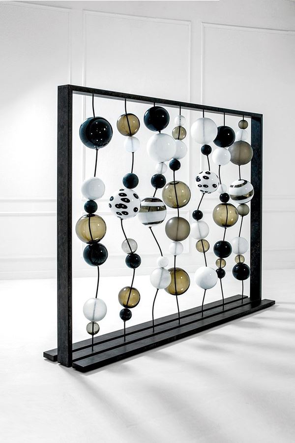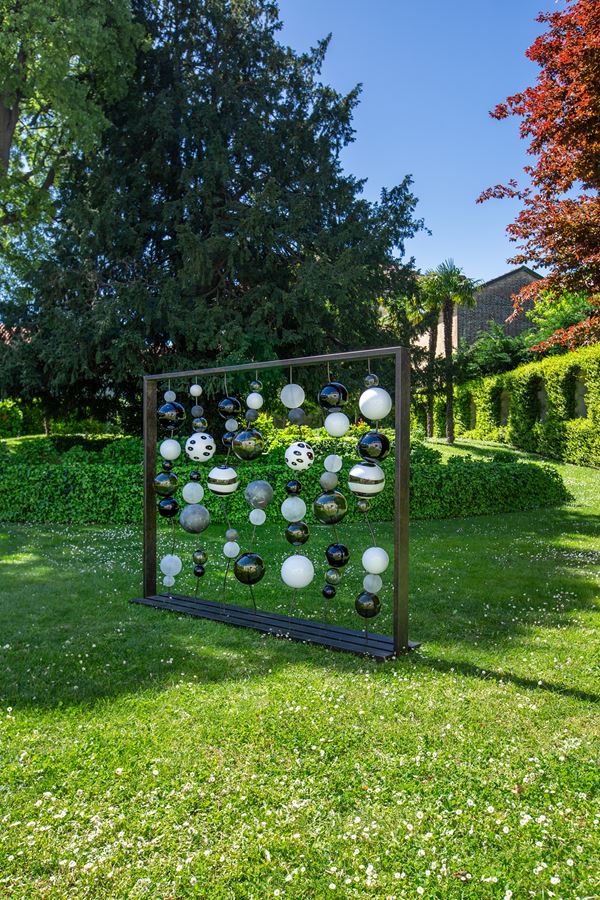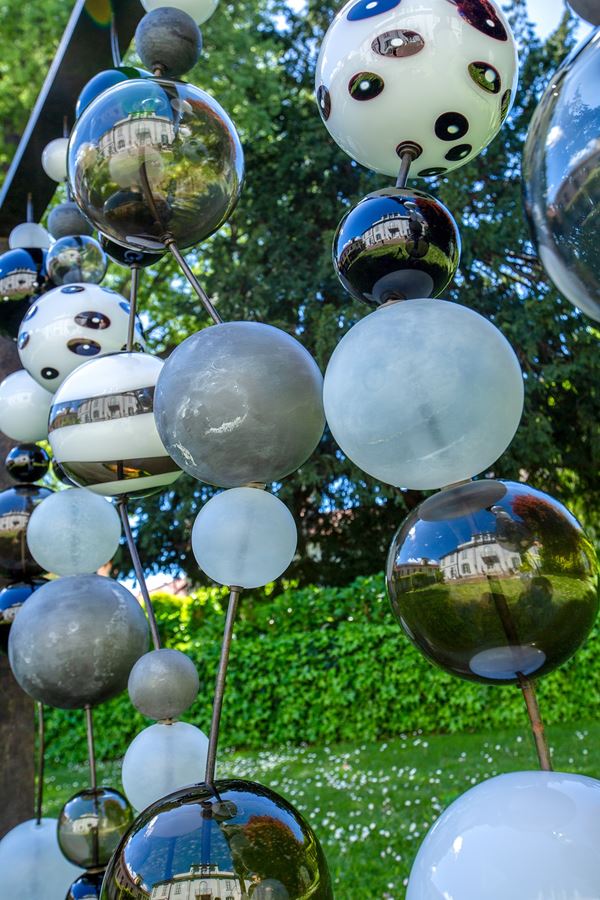 Struttura in ferro brunito e acidato, sfere di diversa misura realizzate in vetro trasparente, vetro velato, battuto, molato, a fasce, a murrine e vetro inciso