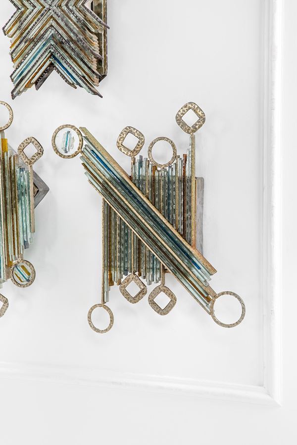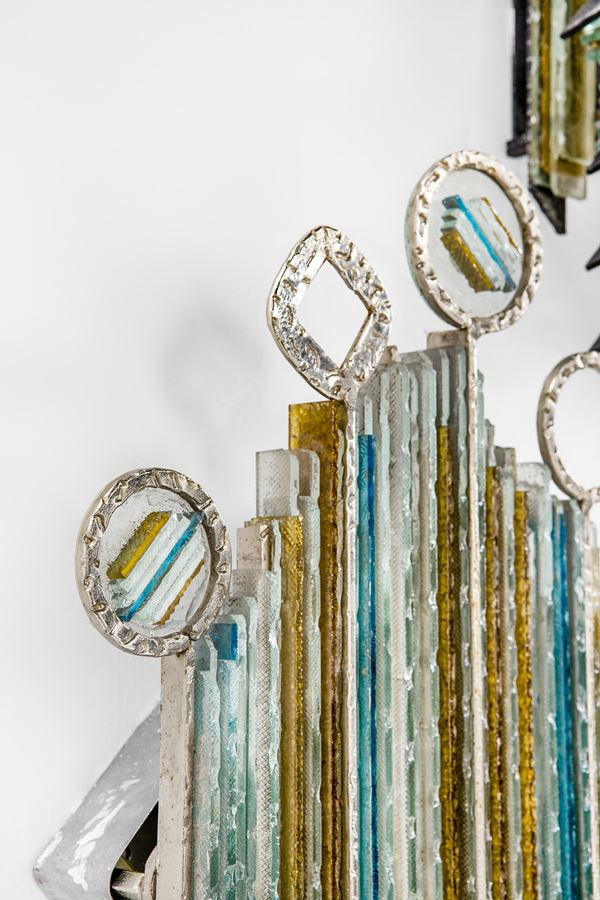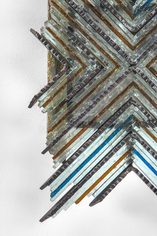 Metallo martellato, vetro policromo.