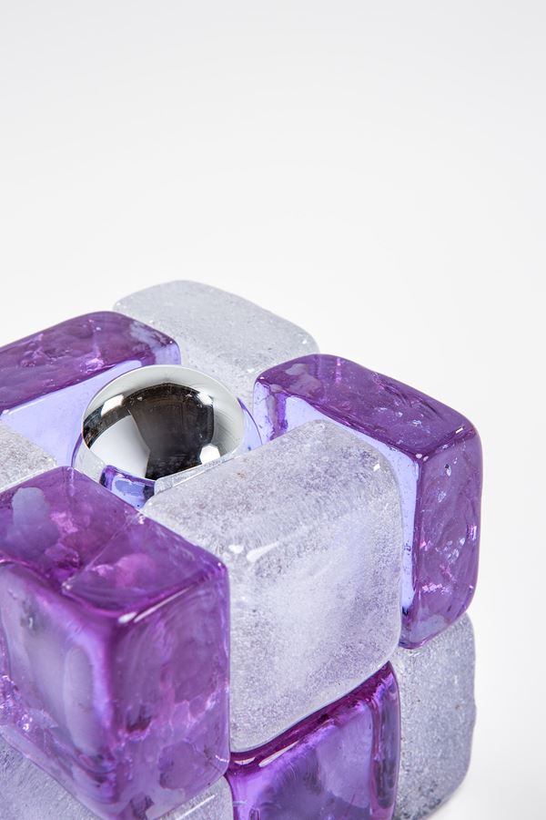 Elementi in vetro di forte spessore di colore bianco e viola, metallo.
