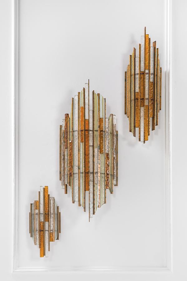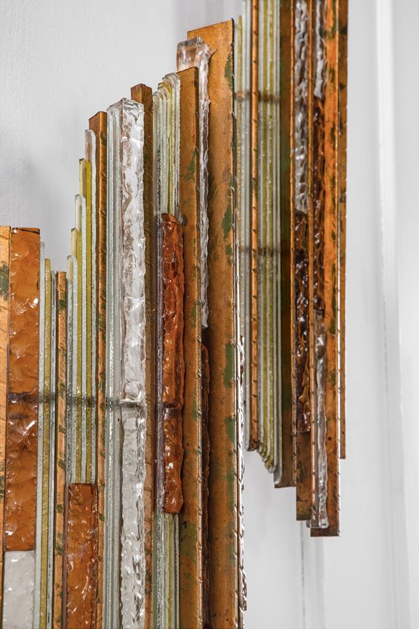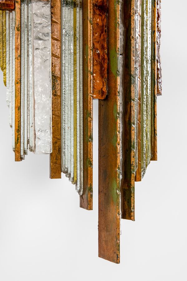 Metallo verniciato, elementi in vetro lavorato a spacco di vari colori.