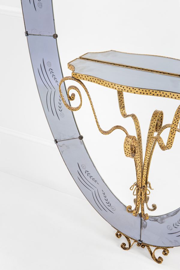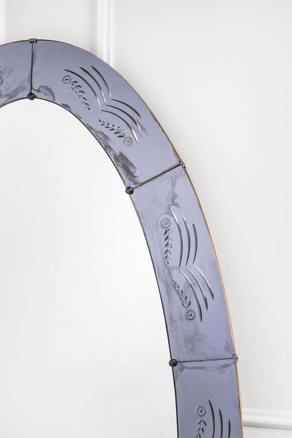 Vetro colorato e inciso, vetro specchiato, bronzo dorato.