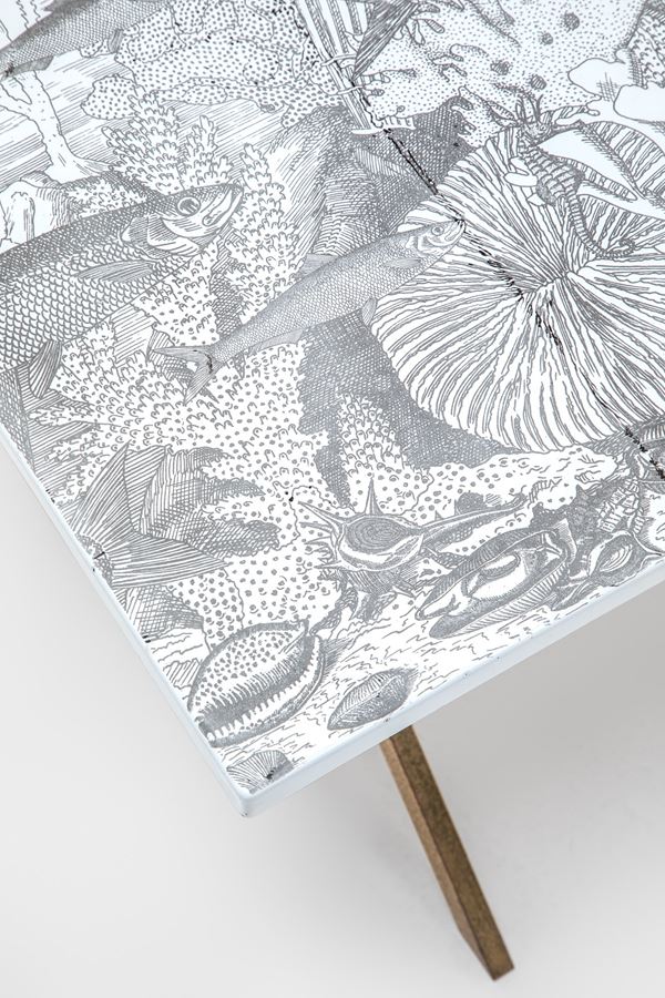 Decoro serigrafato su supporto ligneo, tubolare quadrato in ottone.
