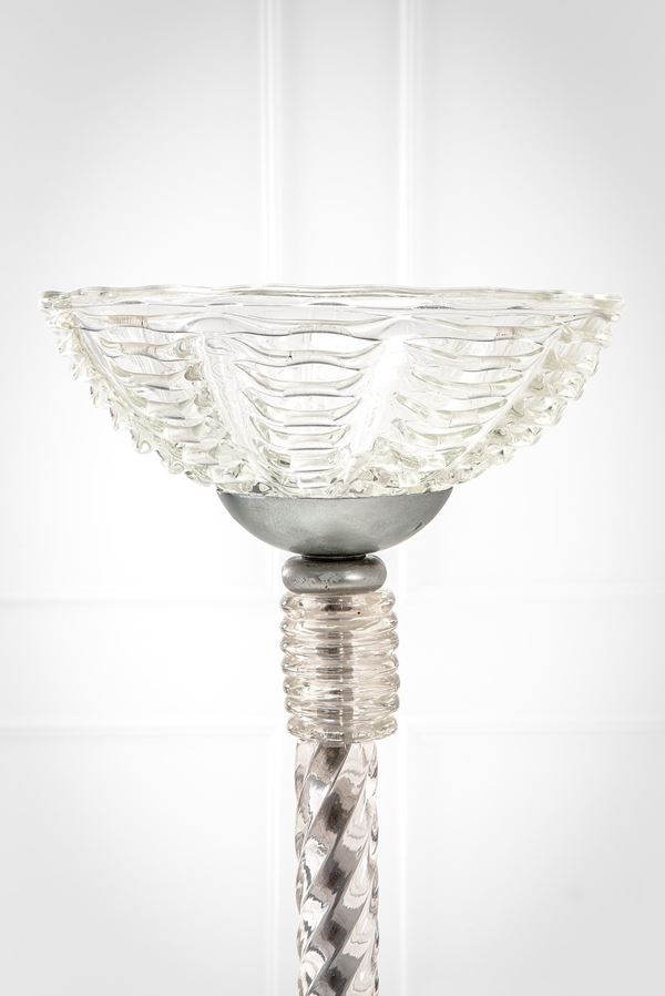 Vetro trasparente a costolature orizzontali, metallo cromato.