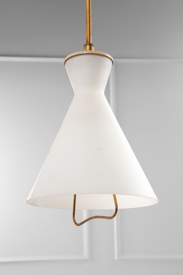 Ottone lucido, metallo verniciato, vetro opalino satinato.