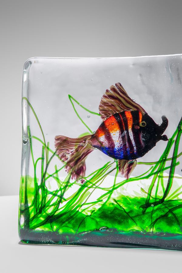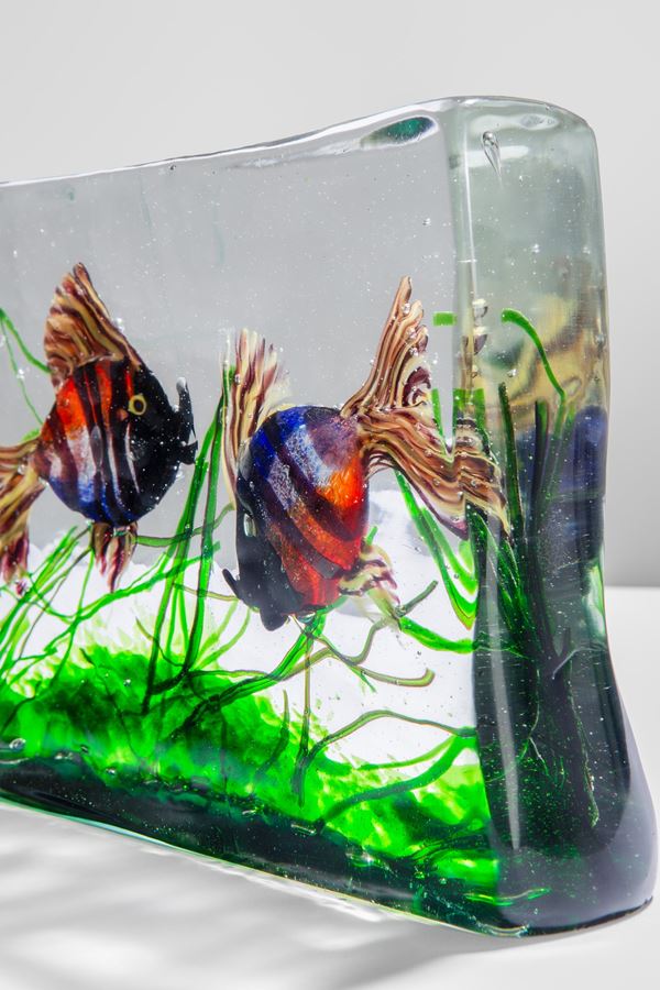 Blocco di vetro incolore che ingloba pesci policromi precedentemente formati.