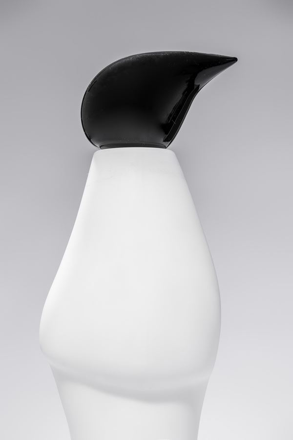 Vetro soffiato bianco con tappo nero lavorato a mano.