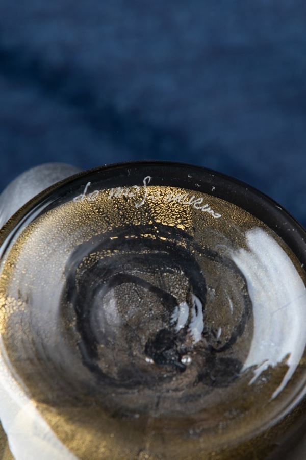 Vetro soffiato e incamiciato, nei colori corallo foglia oro esterno e nero interno.
