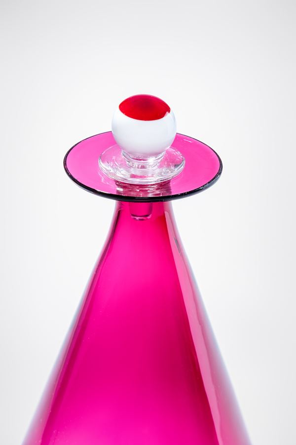 Vetro soffiato rubino e tappo bianco lattimo, cristallo e rubino.