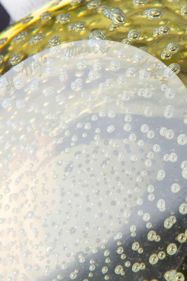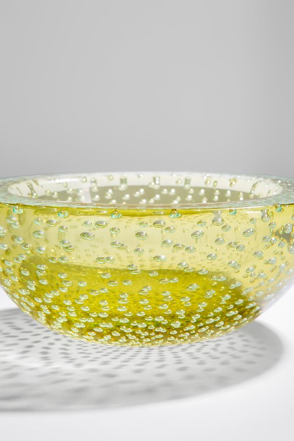 Vetro soffiato giallo paglierino in stampo a bollicine.