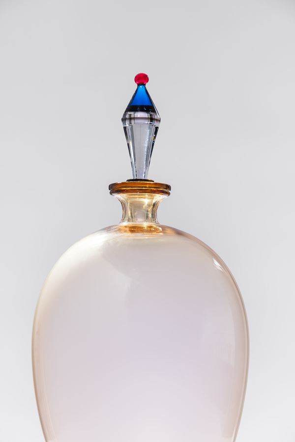 Tappo gioiello in vetro modellato e molato a mano nei colori rosso, acquamarina, cristallo e fumè.