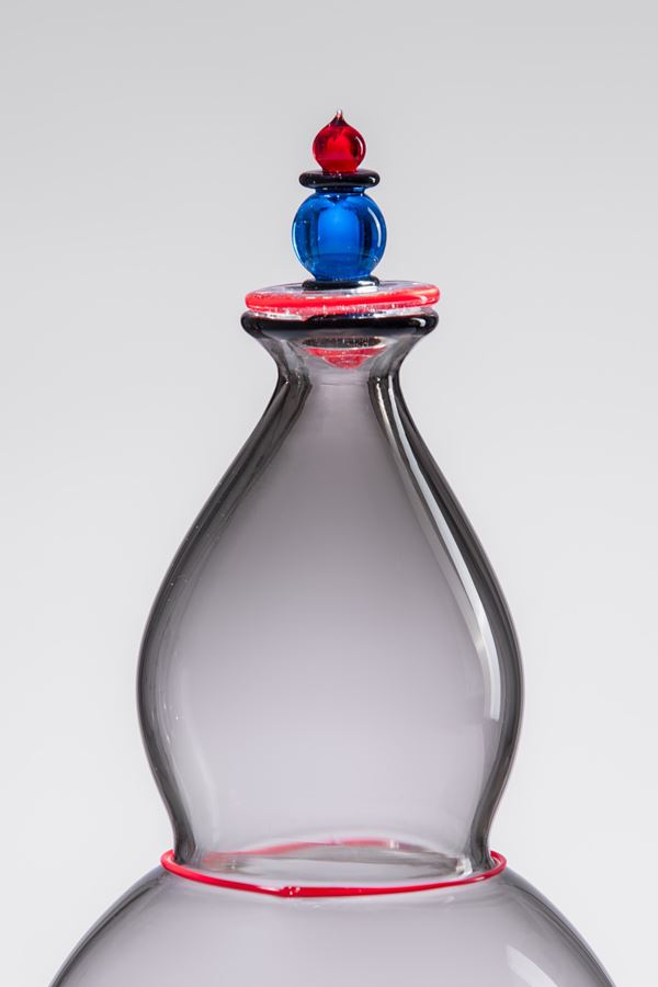 Tappo gioiello in vetro modellato e molato a mano nei colori rosso, blu, cristallo e filo corallo.