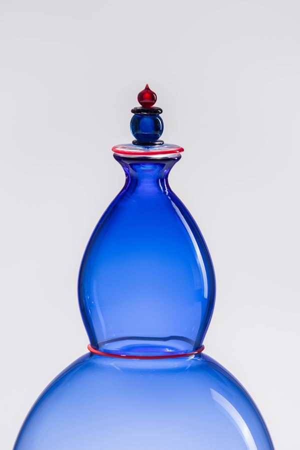 Tappo gioiello in vetro modellato e molato a mano nei colori rosso, blu, cristallo e filo corallo.