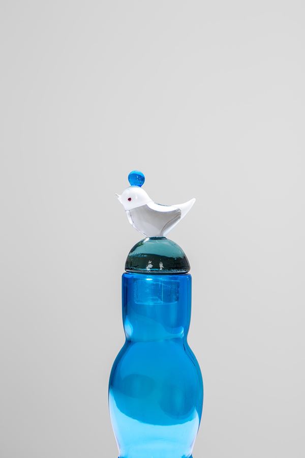 Vetro soffiato acquamarina, tappo acquamarina, lattimo, cristallo, nero e grigio.