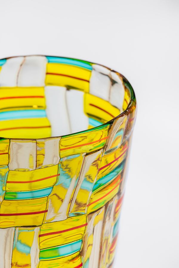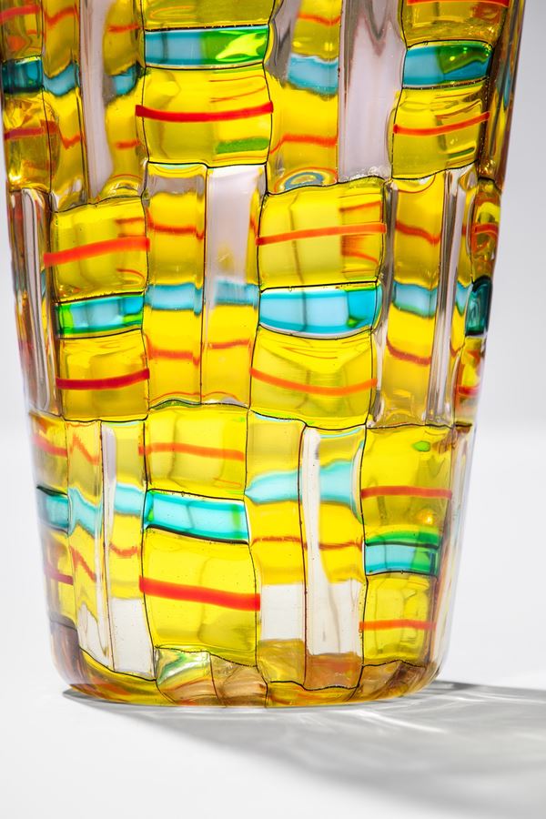 Vetro soffiato a tasselli, nel colore giallo e fumé con fili corallo e nero.