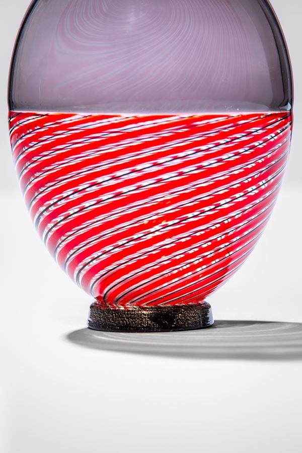 Vetro soffiato, mezza filigrana, incalmo, nei colori grigio con filo nero, mezza filigrana a canne rosso e cristallo con filo nero; base in grigio dorato.