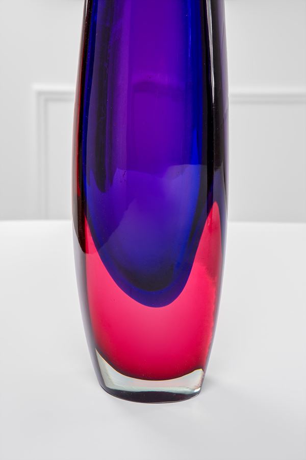 Vetro soffiato sommerso blu, rubino.
