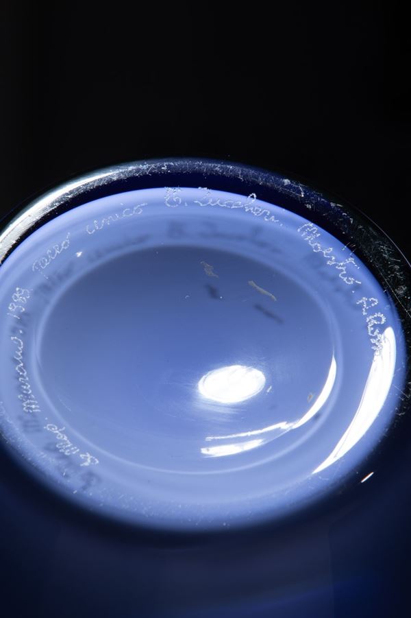 Firma incisa a punta "de Majo Murano 1989 pezzo unico T. Zuccheri maestro De Rossi".