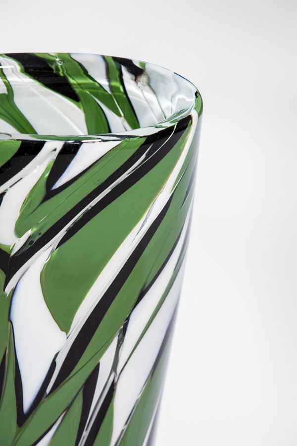 Vetro soffiato cristallo, con applicazioni di fasce in pasta colorate, nei colori avorio, verde e nero.