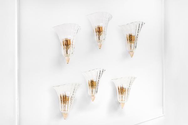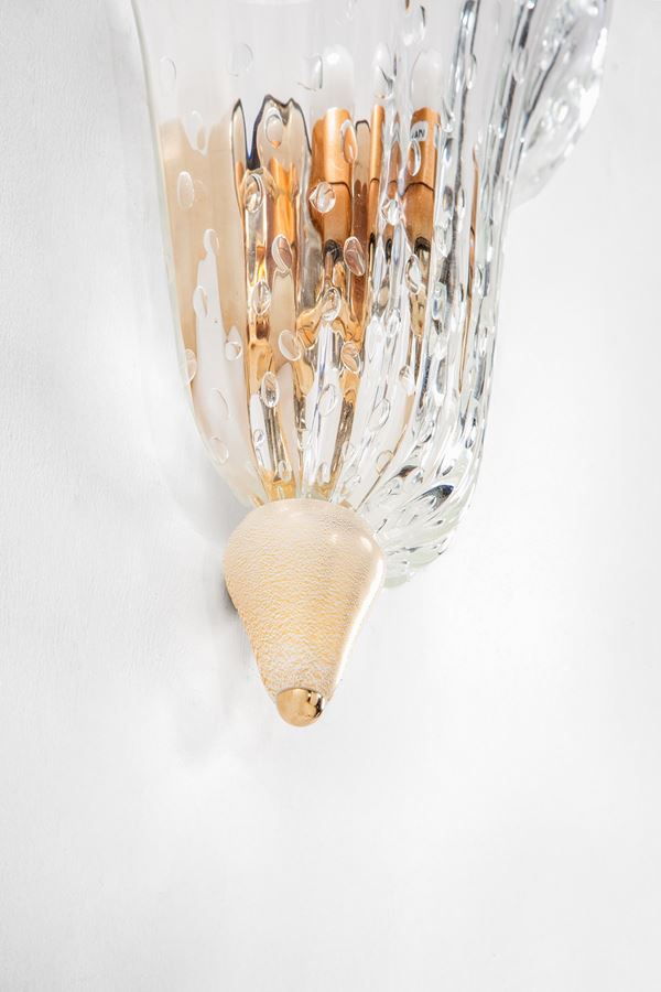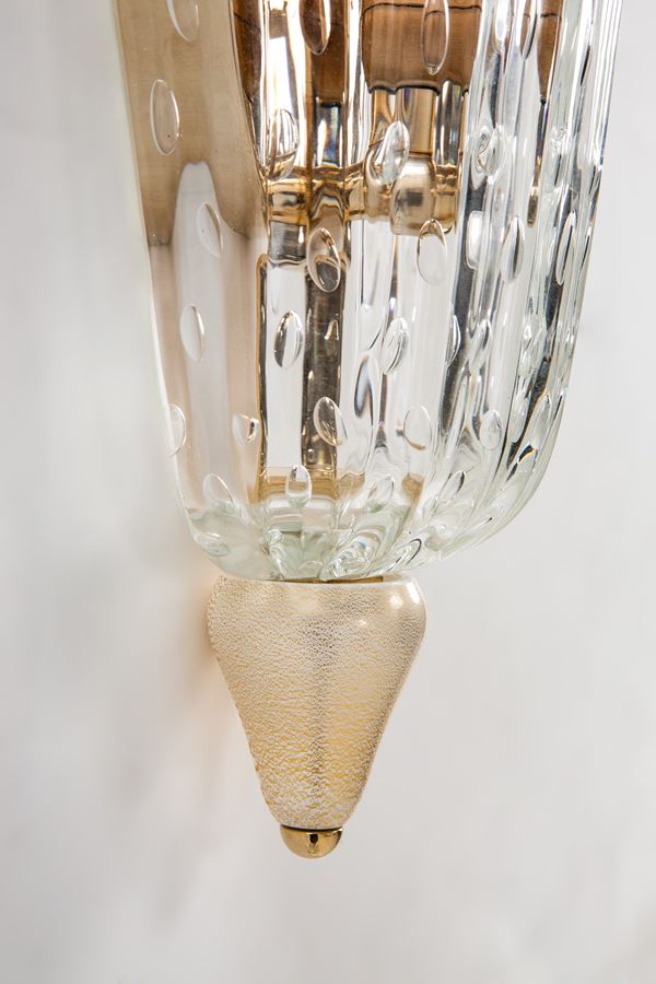 Ottone dorato, vetro trasparente costolato a bollicine, vetro con inclusione d'oro.