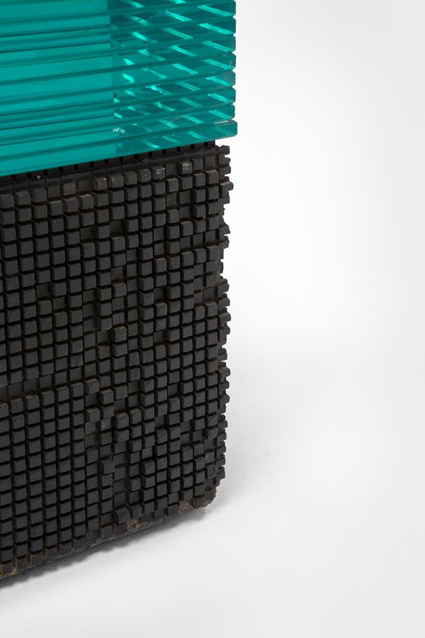 Blocchi in ardesia lavorati con fresature ad intaglio, lastre di cristallo.