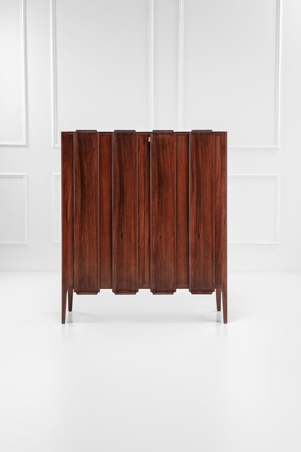 Legno impiallacciato, vetro colorato molato, ottone. Allestimento interno con cassetti e piani in vetro.