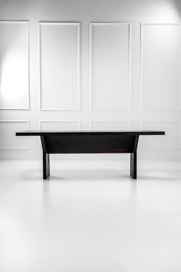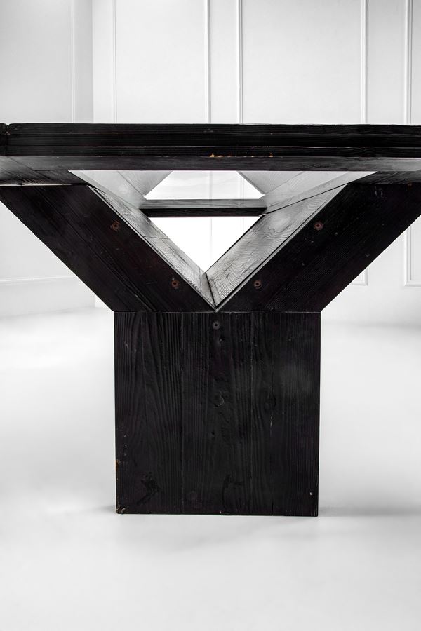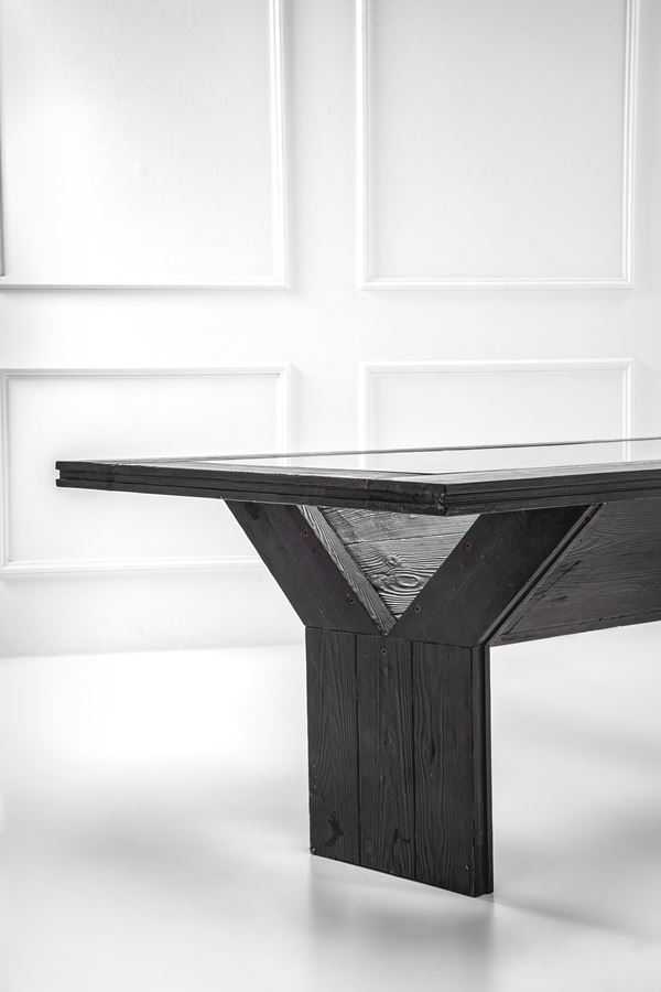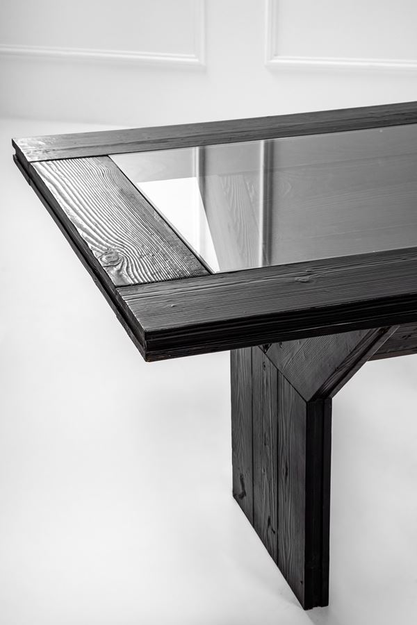 Legno massello trattato con fiamma ossidrica e verniciatura trasparente, cristallo.
