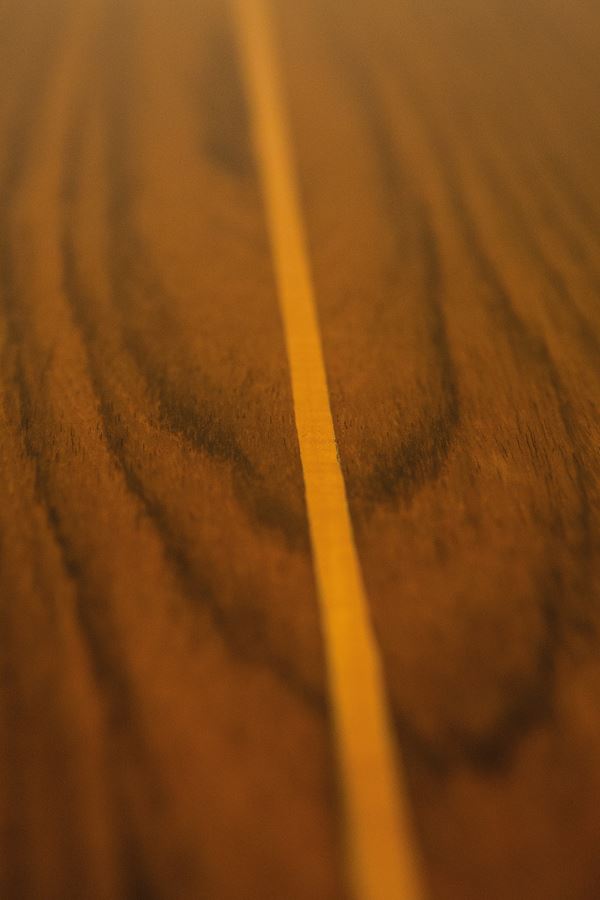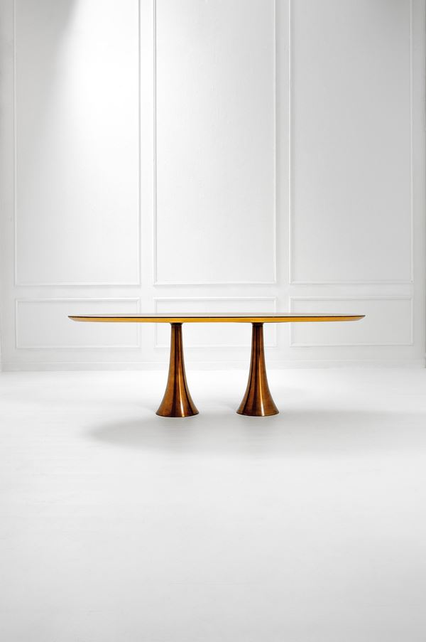 Bronzo patinato rame, piano scantonato in legno listellare: parte superiore lastronata in legno di olmo con intarsio in acero, parte inferiore lastronata in acero.
