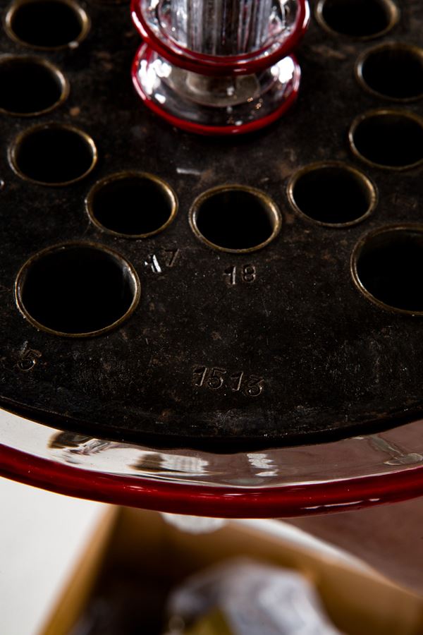 Vetro bluino con dettagli in pasta rossa, ottone.
