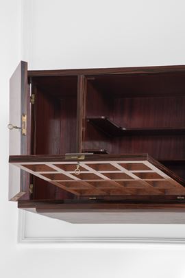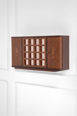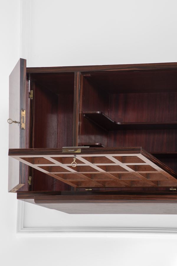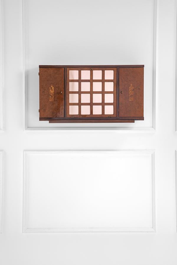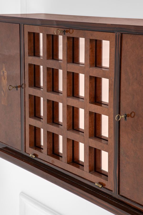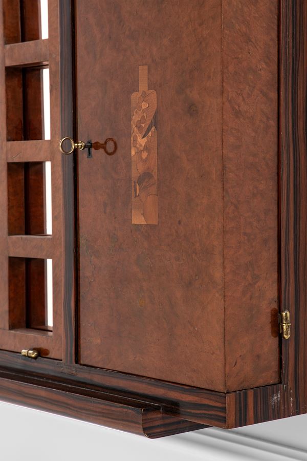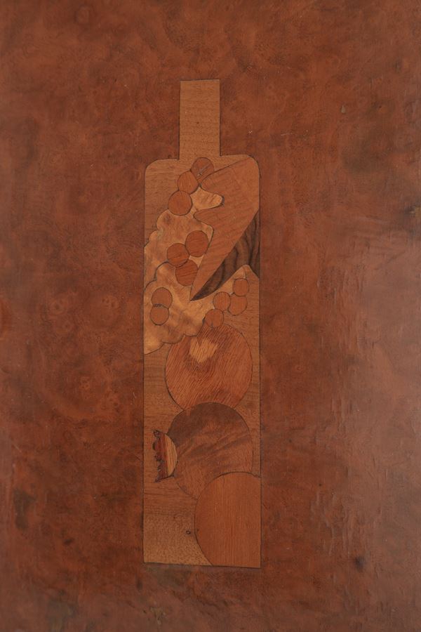 Legno massello, legno impiallacciato, radica, intarsi in varie essenze lignee.