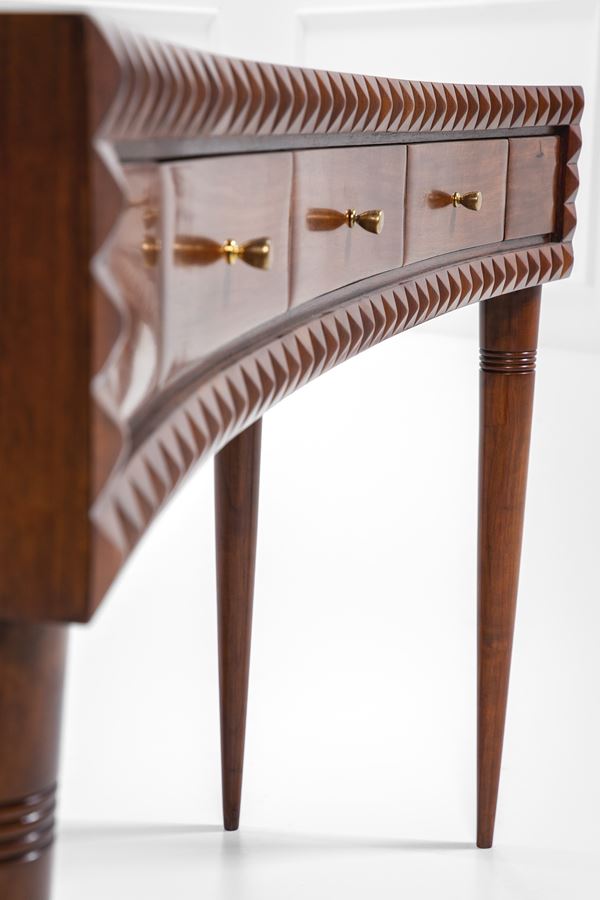Legno massello, legno impiallacciato, legno scolpito a punta di diamante, ottone.