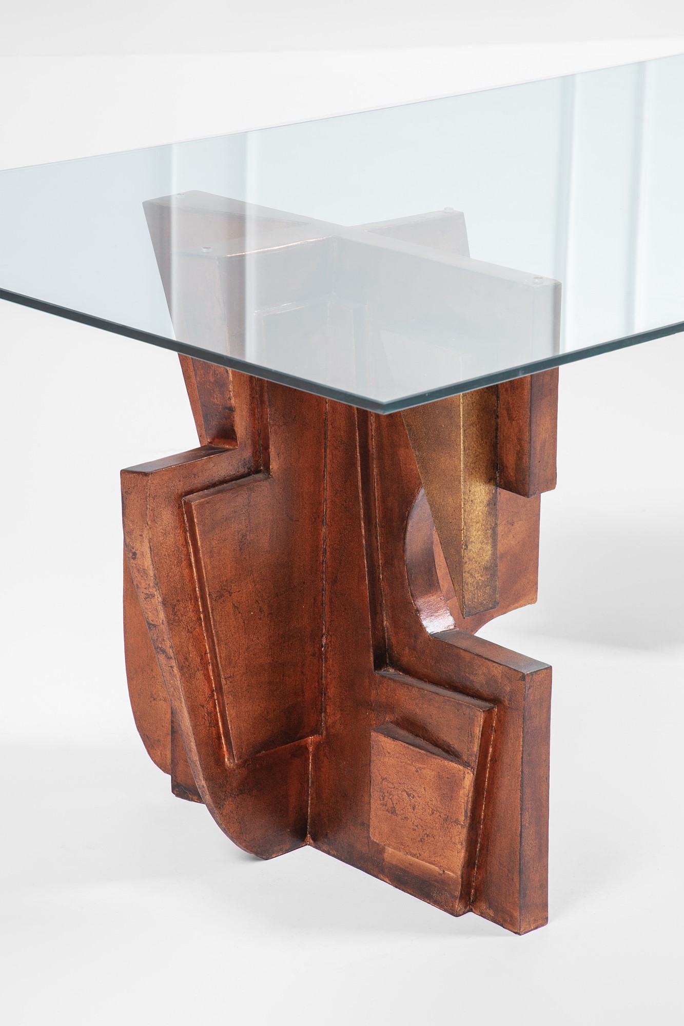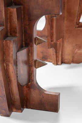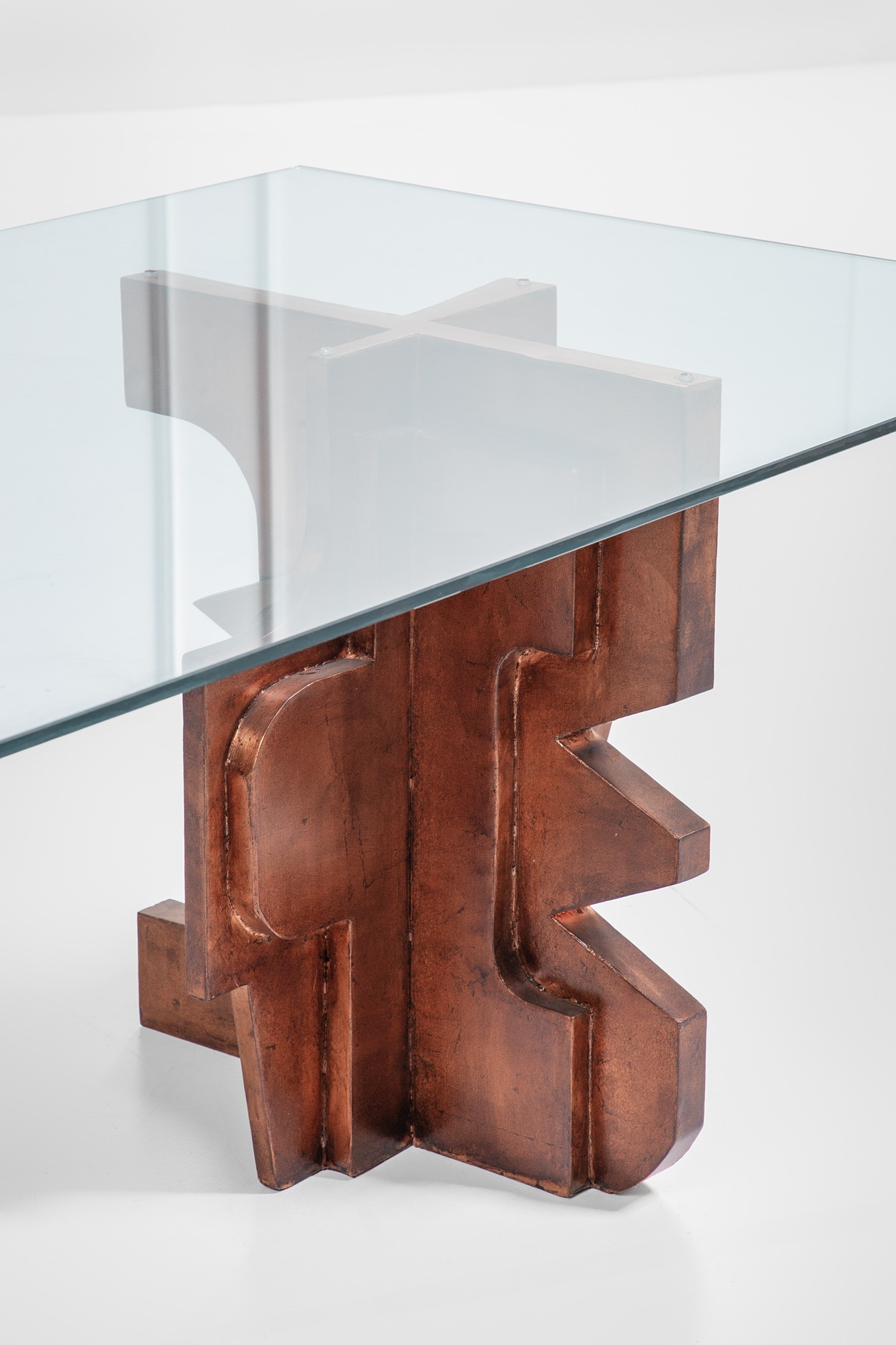 Metallo saldato e trattato con fogli di rame e oro patinati, vetro molato.