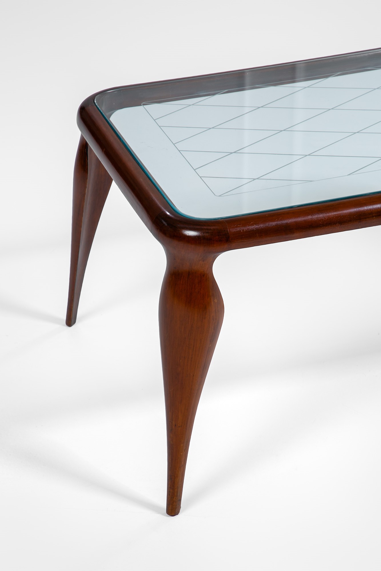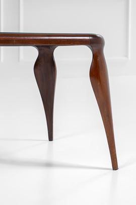 Legno di ciliegio sagomato, vetro serigrafato a losanghe.