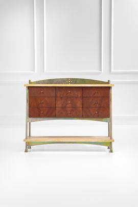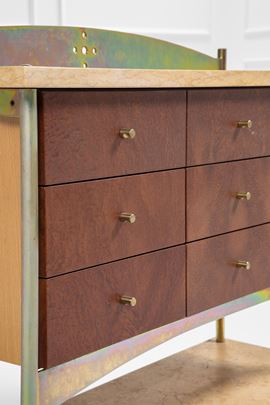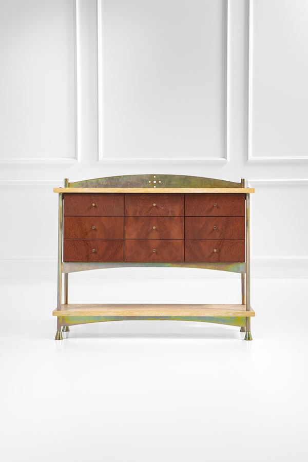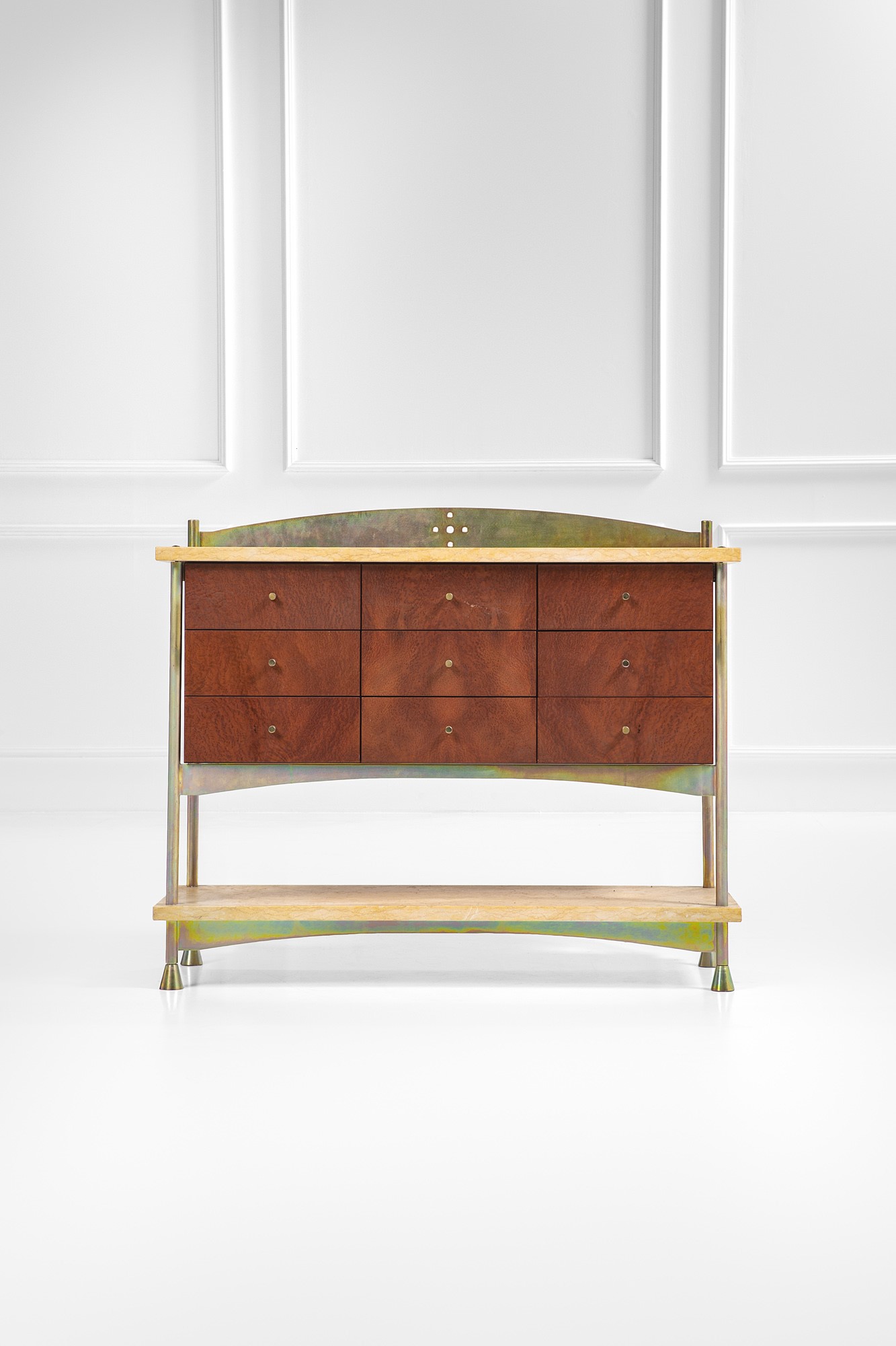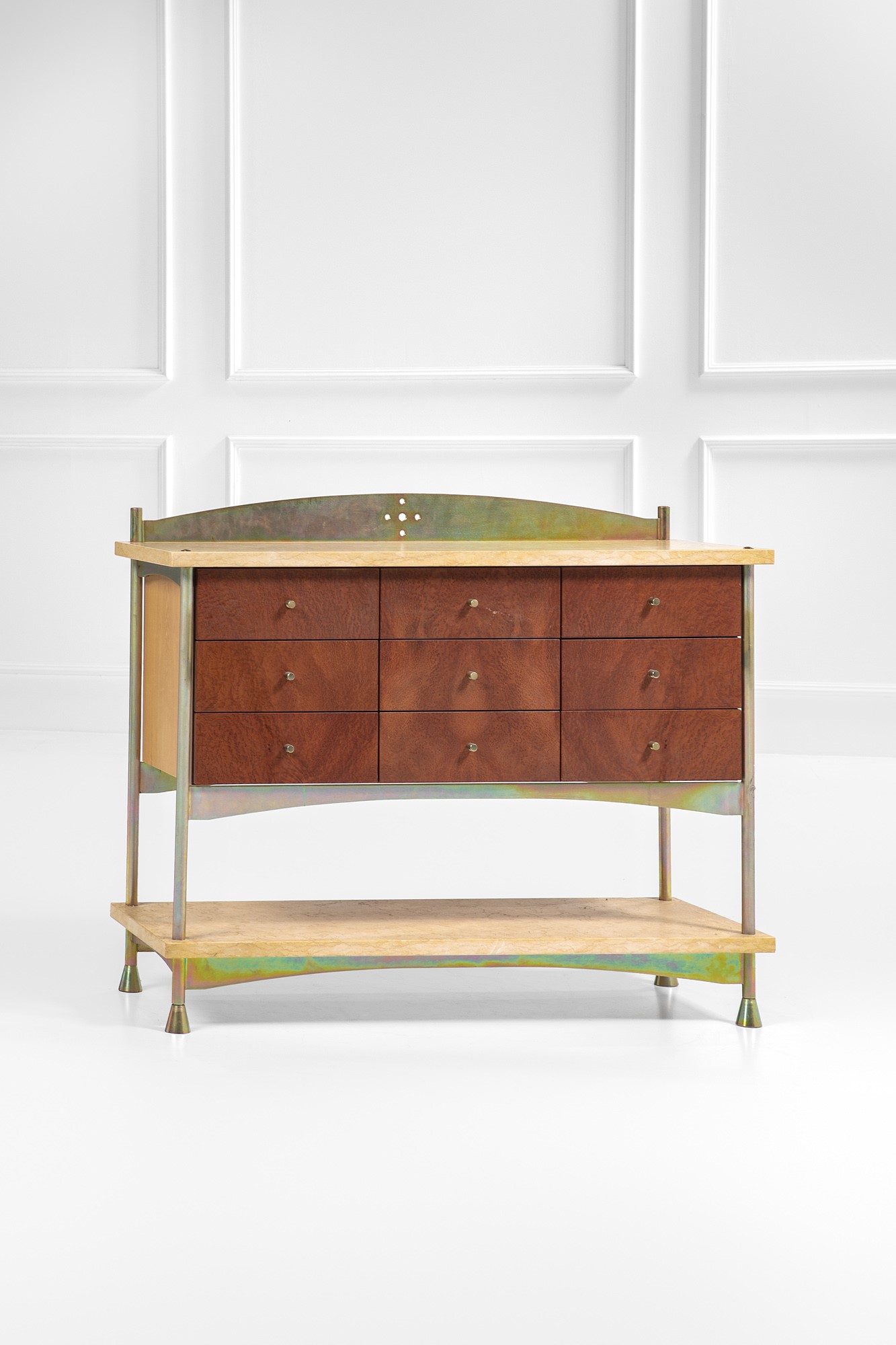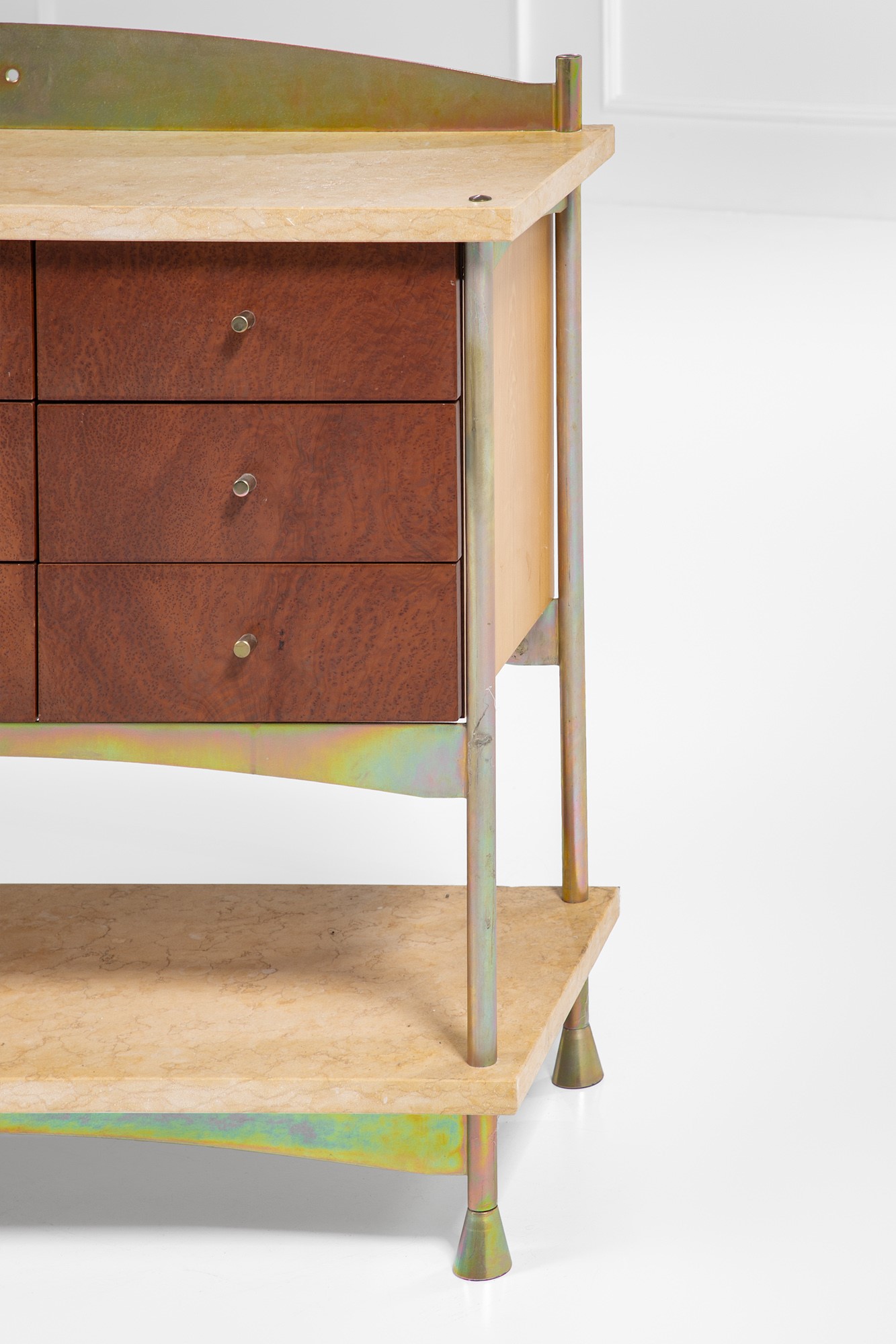 Metallo acidato, legno impiallacciato in radica, ottone, marmo.
